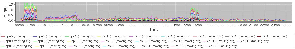 avg(cpu0) = 1.24 avg(cpu1) = 1.16 avg(cpu2) = 0.95 avg(cpu3) = 0.80 avg(cpu4) = 0.69 avg(cpu5) = 0.55 avg(cpu6) = 0.44 avg(cpu7) = 0.34 avg(cpu8) = 0.31 avg(cpu9) = 0.21 avg(cpu10) = 0.69 avg(cpu11) = 0.19 avg(cpu12) = 0.42 avg(cpu13) = 0.42 avg(cpu14) = 0.96 avg(cpu15) = 1.07 avg(cpu16) = 0.57 avg(cpu17) = 0.59 avg(cpu18) = 0.44 avg(cpu19) = 0.43 avg(cpu20) = 0.39 avg(cpu21) = 0.17 avg(cpu22) = 0.27 avg(cpu23) = 0.18