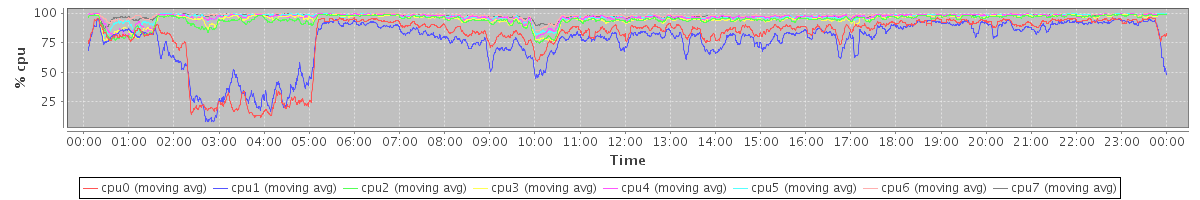 avg(cpu0) = 79.64 avg(cpu1) = 75.65 avg(cpu2) = 94.33 avg(cpu3) = 94.71 avg(cpu4) = 96.45 avg(cpu5) = 96.71 avg(cpu6) = 97.88 avg(cpu7) = 97.55