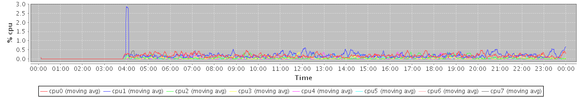 avg(cpu0) = 0.12 avg(cpu1) = 0.11 avg(cpu2) = 0.05 avg(cpu3) = 0.04 avg(cpu4) = 0.02 avg(cpu5) = 0.02 avg(cpu6) = 0.03 avg(cpu7) = 0.00
