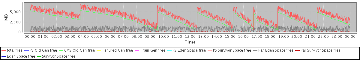 avg(total free) = 4041.53 avg(PS Old Gen free) = 0.00 avg(CMS Old Gen free) = 3162.26 avg(Tenured Gen free) = 0.00 avg(Train Gen free) = 0.00 avg(PS Eden Space free) = 0.00 avg(PS Survivor Space free) = 0.00 avg(Par Eden Space free) = 808.94 avg(Par Survivor Space free) = 70.33 avg(Eden Space free) = 0.00 avg(Survivor Space free) = 0.00