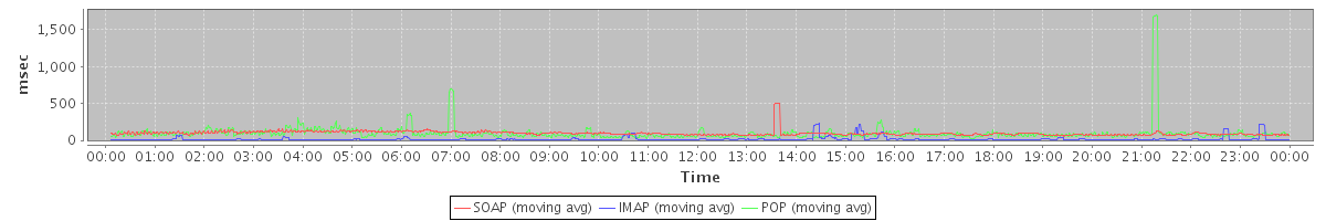 avg(SendMsgRequest) = 441.93 avg(BackupQueryRequest) = 255.50 avg(GetAggregateQuotaUsageOnServerRequest) = 1328.00 avg(WaitSetRequest) = 226.18 avg(SendInviteReplyRequest) = 368.00 avg(ApplyFilterRulesRequest) = 2622.23 avg(ModifyPrefsRequest) = 1232.02 avg(FolderActionRequest.empty) = 168.20 avg(BackupRequest) = 13872.00 avg(GetQuotaUsageRequest) = 2136.00