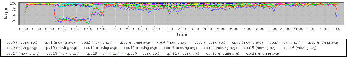 avg(cpu0) = 0.21 avg(cpu1) = 0.21 avg(cpu2) = 0.07 avg(cpu3) = 0.07 avg(cpu4) = 0.05 avg(cpu5) = 0.04 avg(cpu6) = 0.03 avg(cpu7) = 0.03 avg(cpu8) = 0.03 avg(cpu9) = 0.03 avg(cpu10) = 0.08 avg(cpu11) = 0.02 avg(cpu12) = 0.02 avg(cpu13) = 0.03 avg(cpu14) = 0.42 avg(cpu15) = 0.46 avg(cpu16) = 0.20 avg(cpu17) = 0.31 avg(cpu18) = 0.04 avg(cpu19) = 0.10 avg(cpu20) = 0.02 avg(cpu21) = 0.04 avg(cpu22) = 0.04 avg(cpu23) = 0.02