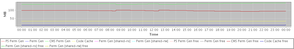 avg(PS Perm Gen) = 0.00 avg(Perm Gen) = 0.00 avg(CMS Perm Gen) = 136.79 avg(Code Cache) = 34.73 avg(Perm Gen [shared-ro]) = 0.00 avg(Perm Gen [shared-rw]) = 0.00 avg(PS Perm Gen free) = 0.00 avg(Perm Gen free) = 0.00 avg(CMS Perm Gen free) = 96.43 avg(Code Cache free) = 12.02 avg(Perm Gen [shared-ro] free) = 0.00 avg(Perm Gen [shared-rw] free) = 0.00