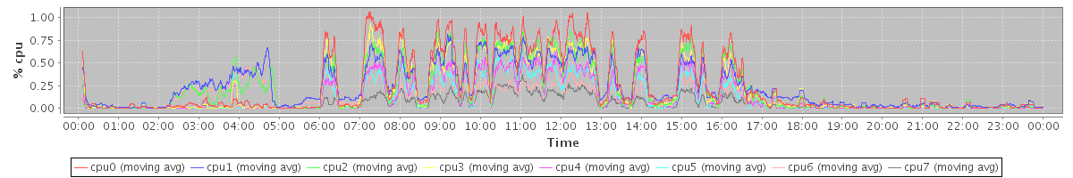 avg(cpu0) = 1.19 avg(cpu1) = 1.18 avg(cpu2) = 0.96 avg(cpu3) = 0.92 avg(cpu4) = 0.63 avg(cpu5) = 0.59 avg(cpu6) = 0.78 avg(cpu7) = 0.35