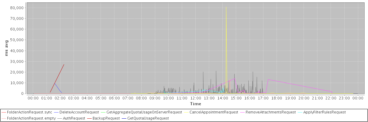 avg(FolderActionRequest.sync) = 3104.00 avg(DeleteAccountRequest) = 4105.00 avg(GetAggregateQuotaUsageOnServerRequest) = 1705.00 avg(CancelAppointmentRequest) = 607.49 avg(RemoveAttachmentsRequest) = 2046.68 avg(ApplyFilterRulesRequest) = 2564.68 avg(FolderActionRequest.empty) = 451.19 avg(AuthRequest) = 664.04 avg(BackupRequest) = 14193.50 avg(GetQuotaUsageRequest) = 2925.00