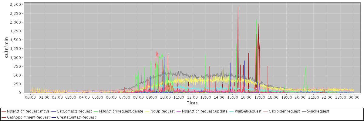 max(MsgActionRequest.move) = 1178.00 max(GetContactsRequest) = 1016.00 max(MsgActionRequest.delete) = 2062.00 max(NoOpRequest) = 644.00 max(MsgActionRequest.update) = 230.00 max(WaitSetRequest) = 259.00 max(GetFolderRequest) = 530.00 max(SyncRequest) = 762.00 max(GetAppointmentRequest) = 2437.00 max(CreateContactRequest) = 191.00