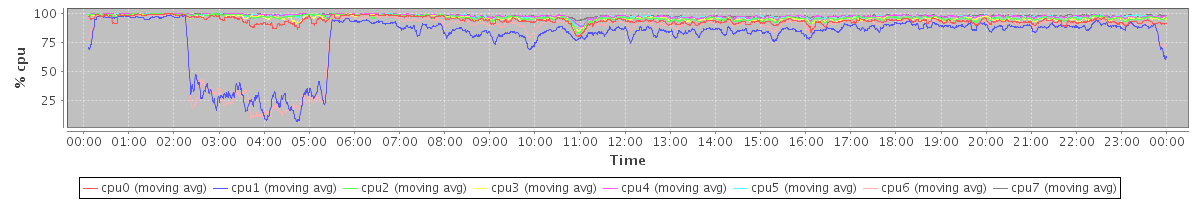 avg(cpu0) = 93.86 avg(cpu1) = 79.32 avg(cpu2) = 96.26 avg(cpu3) = 95.89 avg(cpu4) = 97.70 avg(cpu5) = 97.53 avg(cpu6) = 83.49 avg(cpu7) = 98.07