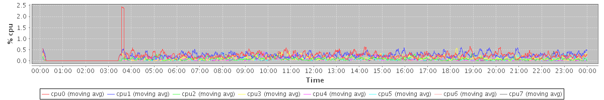 avg(cpu0) = 0.25 avg(cpu1) = 0.28 avg(cpu2) = 0.16 avg(cpu3) = 0.17 avg(cpu4) = 0.11 avg(cpu5) = 0.08 avg(cpu6) = 0.06 avg(cpu7) = 0.04
