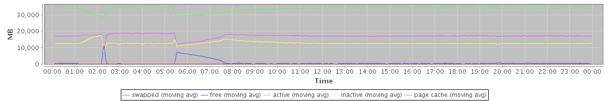 avg(swapped) = 5.54 avg(free) = 812.23 avg(active) = 33474.77 avg(inactive) = 12778.37 avg(page cache) = 17074.35