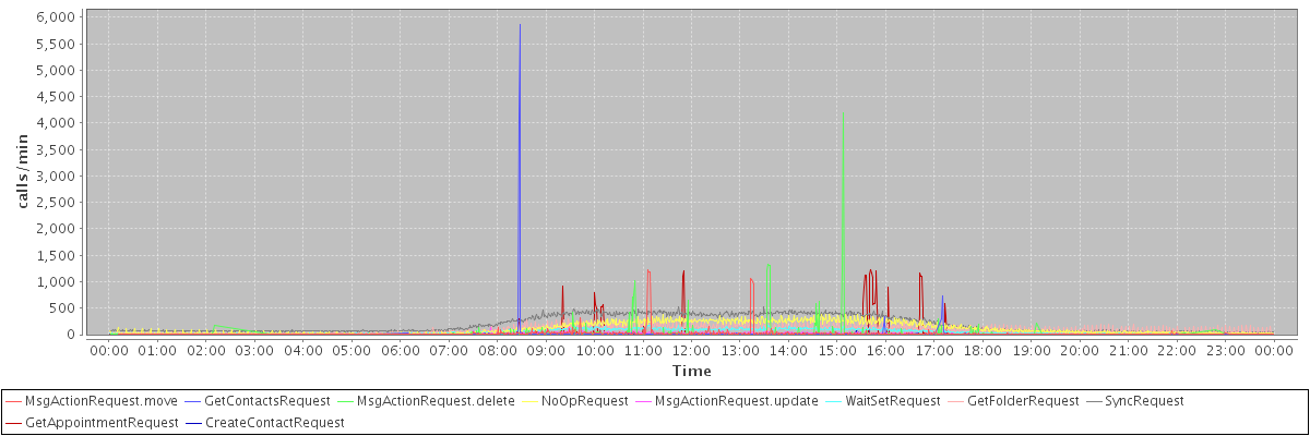 max(MsgActionRequest.move) = 1232.00 max(GetContactsRequest) = 5871.00 max(MsgActionRequest.delete) = 4202.00 max(NoOpRequest) = 390.00 max(MsgActionRequest.update) = 175.00 max(WaitSetRequest) = 185.00 max(GetFolderRequest) = 316.00 max(SyncRequest) = 523.00 max(GetAppointmentRequest) = 1228.00 max(CreateContactRequest) = 263.00