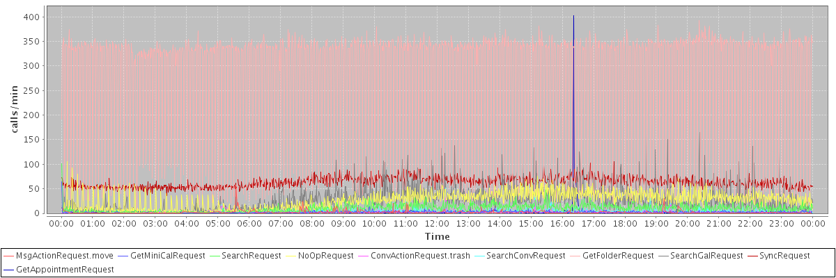 max(MsgActionRequest.move) = 58.00 max(GetMiniCalRequest) = 65.00 max(SearchRequest) = 101.00 max(NoOpRequest) = 105.00 max(ConvActionRequest.trash) = 42.00 max(SearchConvRequest) = 52.00 max(GetFolderRequest) = 392.00 max(SearchGalRequest) = 165.00 max(SyncRequest) = 106.00 max(GetAppointmentRequest) = 403.00