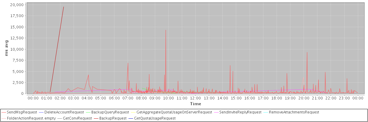 avg(SendMsgRequest) = 446.33 avg(DeleteAccountRequest) = 12994.00 avg(BackupQueryRequest) = 418.50 avg(GetAggregateQuotaUsageOnServerRequest) = 2781.00 avg(SendInviteReplyRequest) = 424.00 avg(RemoveAttachmentsRequest) = 1471.00 avg(FolderActionRequest.empty) = 300.18 avg(GetConvRequest) = 368.00 avg(BackupRequest) = 9968.50 avg(GetQuotaUsageRequest) = 4500.00