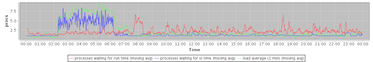 avg(processes waiting for run time) = 1.63 avg(processes waiting for io time) = 1.03 avg(load average (1 min)) = 2.35