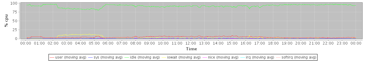 avg(user) = 4.50 avg(sys) = 0.74 avg(idle) = 91.94 avg(iowait) = 2.61 avg(nice) = 0.11 avg(irq) = 0.00 avg(softirq) = 0.11