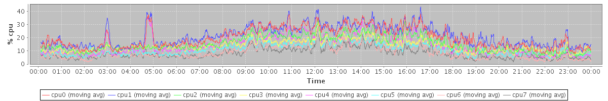 avg(cpu0) = 19.92 avg(cpu1) = 21.22 avg(cpu2) = 15.35 avg(cpu3) = 13.91 avg(cpu4) = 14.28 avg(cpu5) = 11.44 avg(cpu6) = 8.95 avg(cpu7) = 8.21