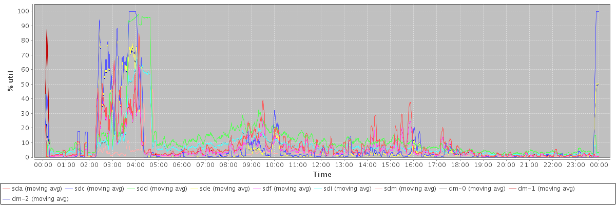 avg(sda) = 8.27 avg(sdc) = 8.69 avg(sdd) = 13.41 avg(sde) = 6.53 avg(sdf) = 6.15 avg(sdi) = 8.38 avg(sdm) = 2.25 avg(dm-0) = 8.57 avg(dm-1) = 6.57 avg(dm-2) = 6.70