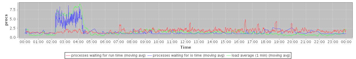 avg(processes waiting for run time) = 1.06 avg(processes waiting for io time) = 0.63 avg(load average (1 min)) = 1.66