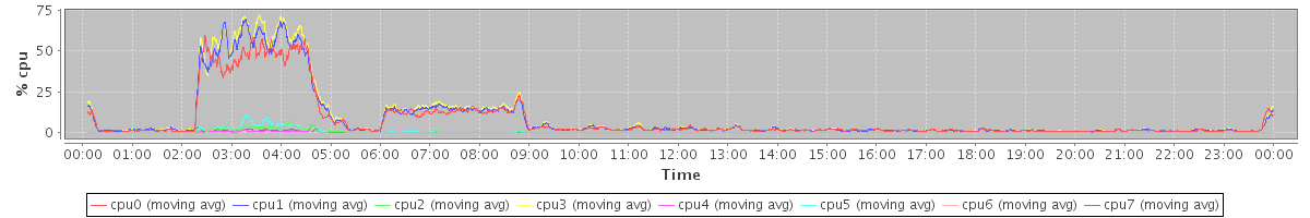 avg(cpu0) = 1.49 avg(cpu1) = 1.38 avg(cpu2) = 1.21 avg(cpu3) = 1.20 avg(cpu4) = 0.91 avg(cpu5) = 0.78 avg(cpu6) = 0.57 avg(cpu7) = 0.50