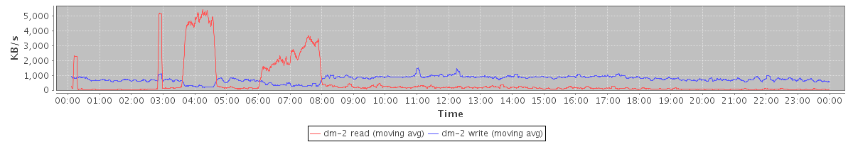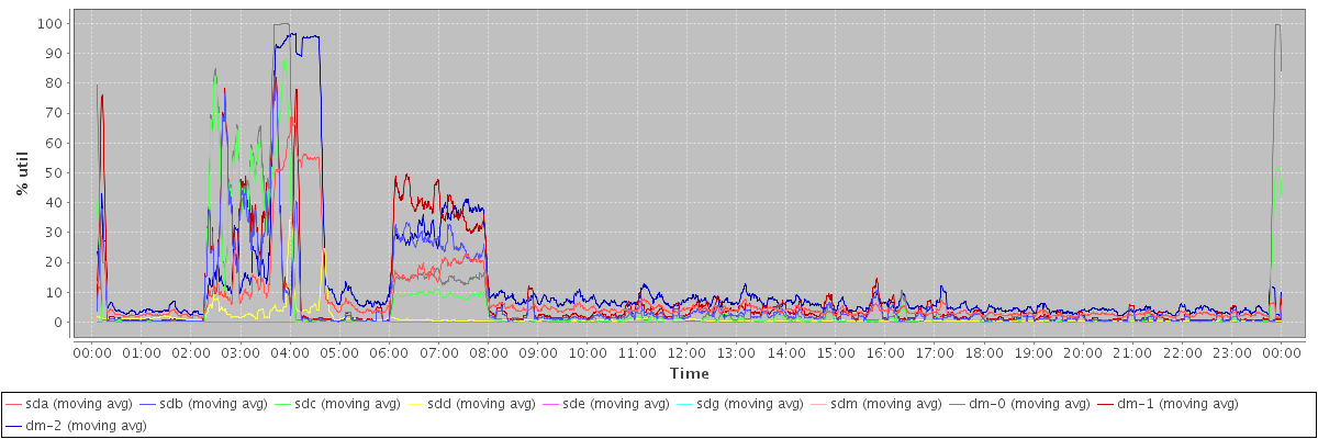 avg(sda) = 7.43 avg(sdb) = 6.35 avg(sdc) = 5.48 avg(sdd) = 1.11 avg(sde) = 0.01 avg(sdg) = 0.01 avg(sdm) = 7.43 avg(dm-0) = 7.53 avg(dm-1) = 8.57 avg(dm-2) = 12.44