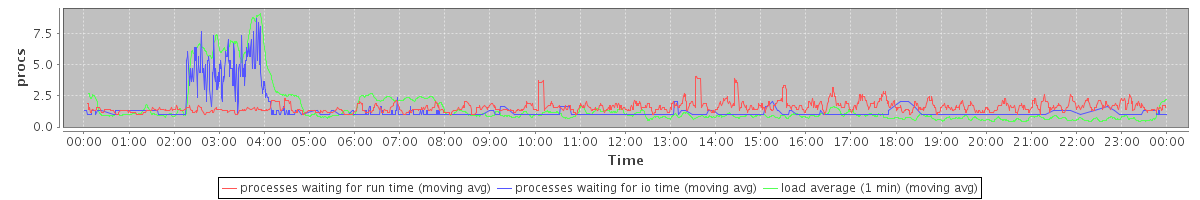 avg(processes waiting for run time) = 0.84 avg(processes waiting for io time) = 0.54 avg(load average (1 min)) = 1.51