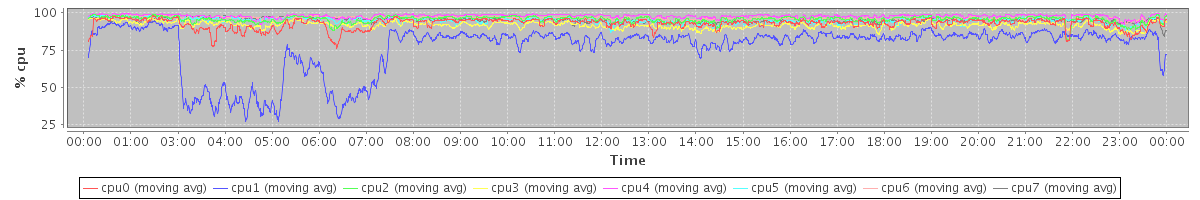 avg(cpu0) = 0.78 avg(cpu1) = 11.25 avg(cpu2) = 0.19 avg(cpu3) = 0.25 avg(cpu4) = 0.10 avg(cpu5) = 0.11 avg(cpu6) = 0.06 avg(cpu7) = 0.10