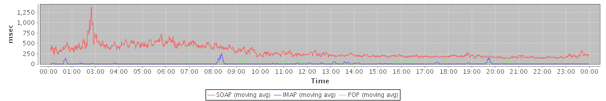 max(GetMsgRequest) = 38.00 max(SearchConvRequest) = 29.00 max(AutoCompleteRequest) = 18.00 max(GetFolderRequest) = 70.00 max(SearchRequest) = 58.00 max(MsgActionRequest.delete) = 197.00 max(NoOpRequest) = 60.00 max(SyncRequest) = 28.00 max(ConvActionRequest.move) = 18.00 max(SaveDraftRequest) = 18.00
