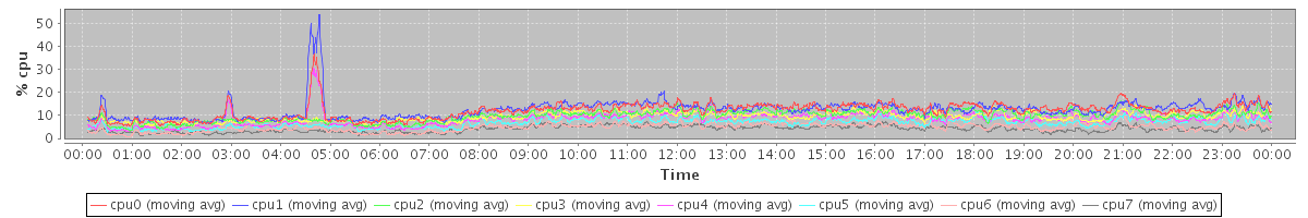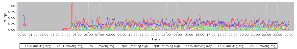 avg(cpu0) = 0.49 avg(cpu1) = 0.50 avg(cpu2) = 0.47 avg(cpu3) = 0.44 avg(cpu4) = 0.33 avg(cpu5) = 0.32 avg(cpu6) = 0.21 avg(cpu7) = 0.17