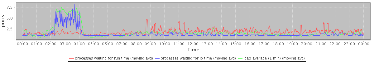 avg(processes waiting for run time) = 1.24 avg(processes waiting for io time) = 0.65 avg(load average (1 min)) = 1.79