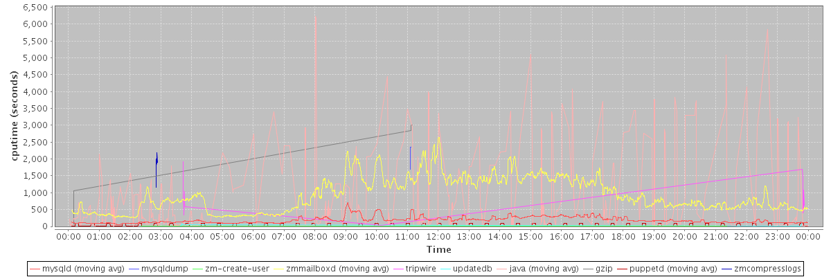 avg(mysqld) = 189.05 avg(mysqldump) = 2133.00 avg(zm-create-user) = 12.90 avg(zmmailboxd) = 929.02 avg(tripwire) = 839.00 avg(updatedb) = 52.79 avg(java) = 746.80 avg(gzip) = 2374.38 avg(puppetd) = 20.06 avg(zmcompresslogs) = 1818.50