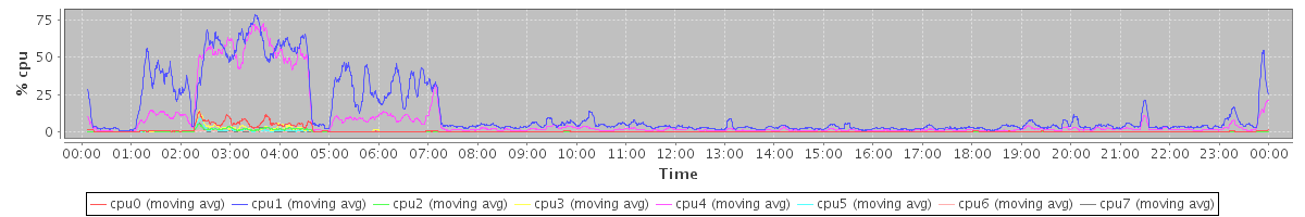 avg(cpu0) = 0.85 avg(cpu1) = 13.31 avg(cpu2) = 0.25 avg(cpu3) = 0.41 avg(cpu4) = 8.19 avg(cpu5) = 0.17 avg(cpu6) = 0.09 avg(cpu7) = 0.09