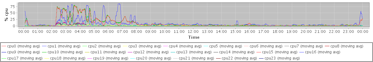 avg(cpu0) = 0.09 avg(cpu1) = 0.12 avg(cpu2) = 0.06 avg(cpu3) = 0.04 avg(cpu4) = 0.04 avg(cpu5) = 0.02 avg(cpu6) = 0.02 avg(cpu7) = 0.01 avg(cpu8) = 0.01 avg(cpu9) = 0.00 avg(cpu10) = 0.05 avg(cpu11) = 0.00 avg(cpu12) = 0.01 avg(cpu13) = 0.01 avg(cpu14) = 0.02 avg(cpu15) = 0.07 avg(cpu16) = 0.02 avg(cpu17) = 0.02 avg(cpu18) = 0.04 avg(cpu19) = 0.01 avg(cpu20) = 0.01 avg(cpu21) = 0.00 avg(cpu22) = 0.00 avg(cpu23) = 0.00