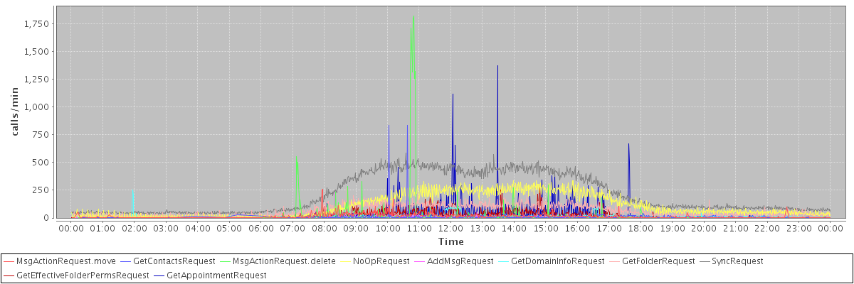 max(MsgActionRequest.move) = 257.00 max(GetContactsRequest) = 836.00 max(MsgActionRequest.delete) = 1821.00 max(NoOpRequest) = 336.00 max(AddMsgRequest) = 225.00 max(GetDomainInfoRequest) = 253.00 max(GetFolderRequest) = 268.00 max(SyncRequest) = 587.00 max(GetEffectiveFolderPermsRequest) = 272.00 max(GetAppointmentRequest) = 1374.00