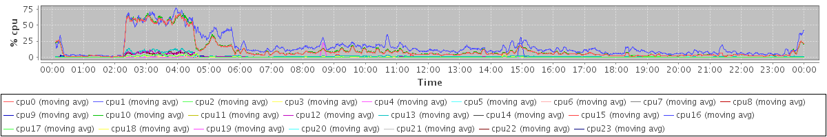avg(cpu0) = 1.20 avg(cpu1) = 1.15 avg(cpu2) = 0.73 avg(cpu3) = 0.65 avg(cpu4) = 0.49 avg(cpu5) = 0.50 avg(cpu6) = 0.38 avg(cpu7) = 0.31 avg(cpu8) = 0.26 avg(cpu9) = 0.21 avg(cpu10) = 0.78 avg(cpu11) = 0.19 avg(cpu12) = 0.46 avg(cpu13) = 0.48 avg(cpu14) = 1.07 avg(cpu15) = 1.10 avg(cpu16) = 0.57 avg(cpu17) = 0.61 avg(cpu18) = 0.49 avg(cpu19) = 0.44 avg(cpu20) = 0.40 avg(cpu21) = 0.17 avg(cpu22) = 0.32 avg(cpu23) = 0.16