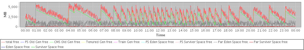 avg(total free) = 3188.93 avg(PS Old Gen free) = 0.00 avg(CMS Old Gen free) = 2321.93 avg(Tenured Gen free) = 0.00 avg(Train Gen free) = 0.00 avg(PS Eden Space free) = 0.00 avg(PS Survivor Space free) = 0.00 avg(Par Eden Space free) = 794.49 avg(Par Survivor Space free) = 72.51 avg(Eden Space free) = 0.00 avg(Survivor Space free) = 0.00