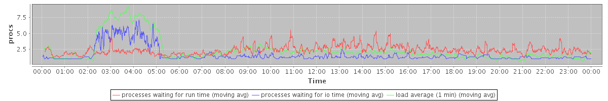 avg(processes waiting for run time) = 2.07 avg(processes waiting for io time) = 0.94 avg(load average (1 min)) = 2.40