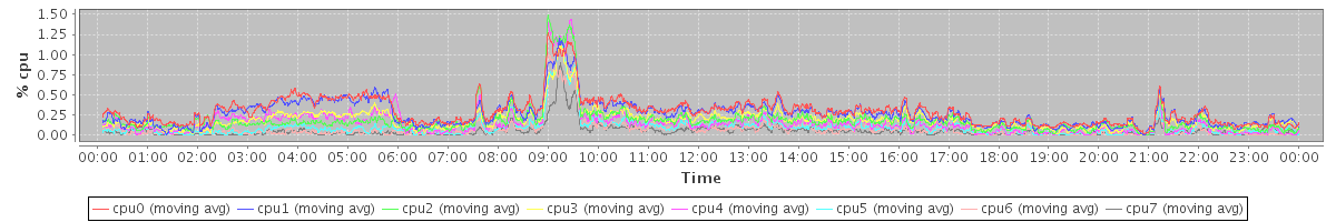 avg(cpu0) = 1.57 avg(cpu1) = 1.47 avg(cpu2) = 1.04 avg(cpu3) = 1.31 avg(cpu4) = 0.87 avg(cpu5) = 0.71 avg(cpu6) = 0.55 avg(cpu7) = 0.45