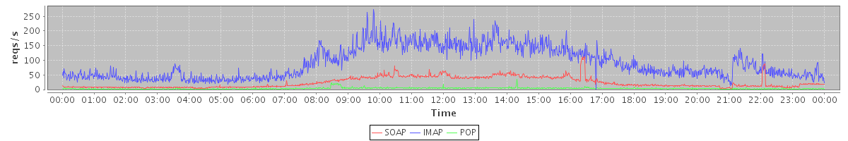 Host zm05.stanford.edu: Mailboxd: Request Rate by Client Protocol