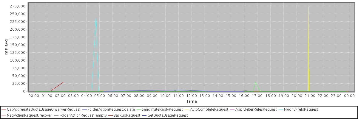 avg(GetAggregateQuotaUsageOnServerRequest) = 1638.00 avg(FolderActionRequest.delete) = 773.67 avg(SendInviteReplyRequest) = 633.51 avg(AutoCompleteRequest) = 537.17 avg(ApplyFilterRulesRequest) = 959.00 avg(ModifyPrefsRequest) = 951.25 avg(MsgActionRequest.recover) = 516.00 avg(FolderActionRequest.empty) = 515.01 avg(BackupRequest) = 15454.00 avg(GetQuotaUsageRequest) = 3008.00