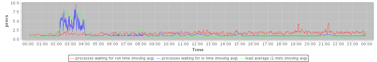 avg(processes waiting for run time) = 1.02 avg(processes waiting for io time) = 0.51 avg(load average (1 min)) = 1.39