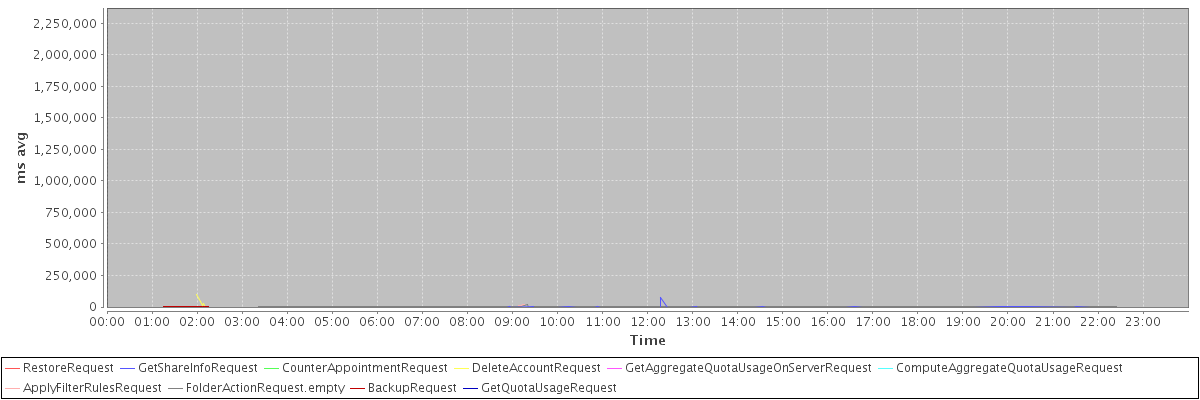 avg(RestoreRequest) = 2256777.00 avg(GetShareInfoRequest) = 630.82 avg(CounterAppointmentRequest) = 700.00 avg(DeleteAccountRequest) = 38579.00 avg(GetAggregateQuotaUsageOnServerRequest) = 1088.00 avg(ComputeAggregateQuotaUsageRequest) = 2043.00 avg(ApplyFilterRulesRequest) = 13813.88 avg(FolderActionRequest.empty) = 879.35 avg(BackupRequest) = 1275.50 avg(GetQuotaUsageRequest) = 1183.00