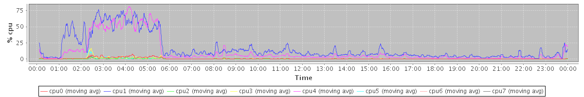 avg(cpu0) = 0.75 avg(cpu1) = 16.01 avg(cpu2) = 0.21 avg(cpu3) = 0.53 avg(cpu4) = 11.23 avg(cpu5) = 0.37 avg(cpu6) = 0.09 avg(cpu7) = 0.13