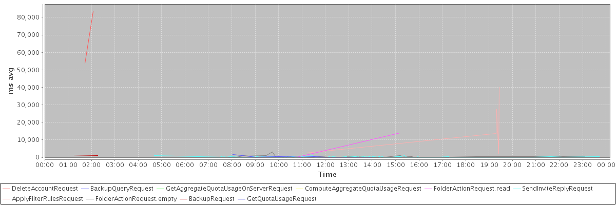 avg(DeleteAccountRequest) = 68646.50 avg(BackupQueryRequest) = 549.00 avg(GetAggregateQuotaUsageOnServerRequest) = 1098.00 avg(ComputeAggregateQuotaUsageRequest) = 2178.00 avg(FolderActionRequest.read) = 6944.00 avg(SendInviteReplyRequest) = 312.60 avg(ApplyFilterRulesRequest) = 17124.00 avg(FolderActionRequest.empty) = 347.46 avg(BackupRequest) = 1081.50 avg(GetQuotaUsageRequest) = 1181.00