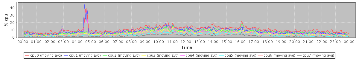 avg(cpu0) = 10.75 avg(cpu1) = 8.66 avg(cpu2) = 7.58 avg(cpu3) = 5.79 avg(cpu4) = 7.04 avg(cpu5) = 3.54 avg(cpu6) = 3.62 avg(cpu7) = 2.47
