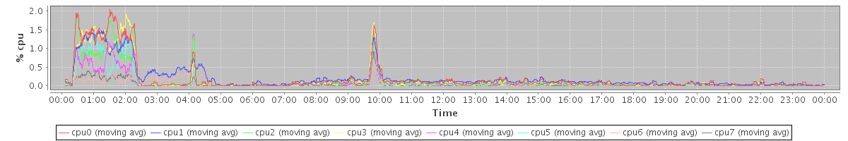 avg(cpu0) = 1.00 avg(cpu1) = 1.09 avg(cpu2) = 0.71 avg(cpu3) = 0.79 avg(cpu4) = 0.48 avg(cpu5) = 0.54 avg(cpu6) = 0.60 avg(cpu7) = 0.30
