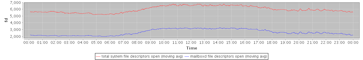 avg(total system file descriptors open) = 5975.80 avg(mailboxd file descriptors open) = 2603.94