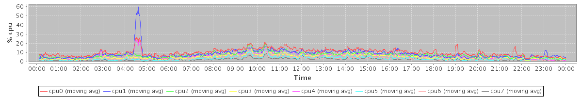 avg(cpu0) = 10.06 avg(cpu1) = 8.34 avg(cpu2) = 7.12 avg(cpu3) = 5.25 avg(cpu4) = 6.34 avg(cpu5) = 3.21 avg(cpu6) = 3.41 avg(cpu7) = 2.44