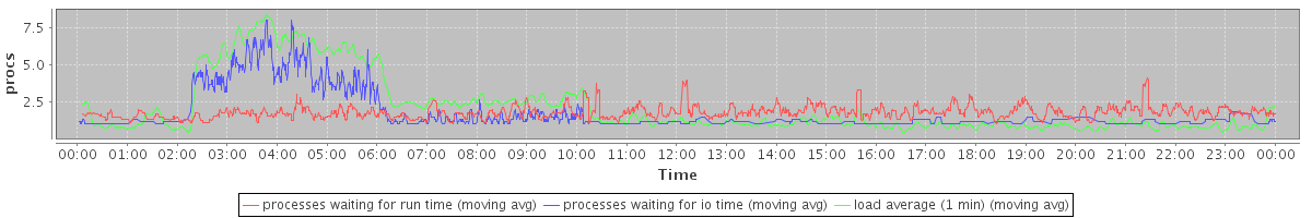 avg(processes waiting for run time) = 1.18 avg(processes waiting for io time) = 1.09 avg(load average (1 min)) = 2.11
