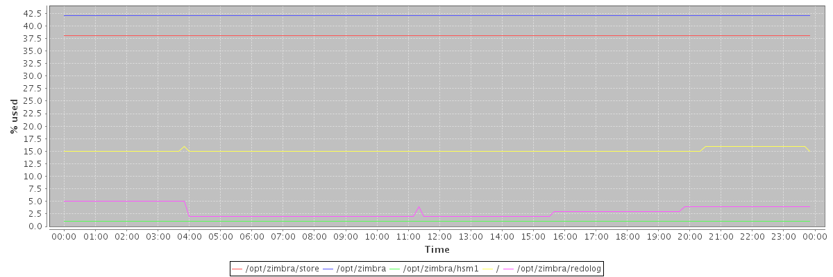 avg(/opt/zimbra/store) = 38.00 avg(/opt/zimbra) = 42.00 avg(/opt/zimbra/hsm1) = 1.00 avg(/) = 15.15 avg(/opt/zimbra/redolog) = 3.03