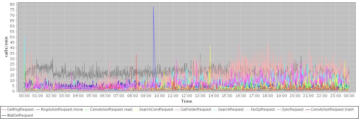 max(GetMsgRequest) = 34.00 max(MsgActionRequest.move) = 78.00 max(ConvActionRequest.read) = 25.00 max(SearchConvRequest) = 42.00 max(GetFolderRequest) = 29.00 max(SearchRequest) = 51.00 max(NoOpRequest) = 45.00 max(SyncRequest) = 35.00 max(ConvActionRequest.trash) = 27.00 max(WaitSetRequest) = 19.00