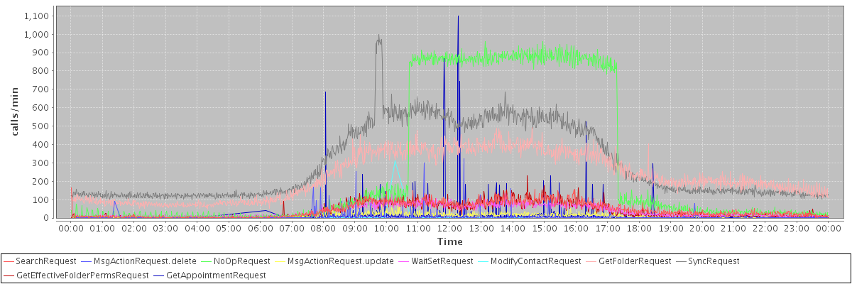 max(SearchRequest) = 166.00 max(MsgActionRequest.delete) = 324.00 max(NoOpRequest) = 960.00 max(MsgActionRequest.update) = 114.00 max(WaitSetRequest) = 133.00 max(ModifyContactRequest) = 311.00 max(GetFolderRequest) = 491.00 max(SyncRequest) = 1000.00 max(GetEffectiveFolderPermsRequest) = 231.00 max(GetAppointmentRequest) = 1100.00